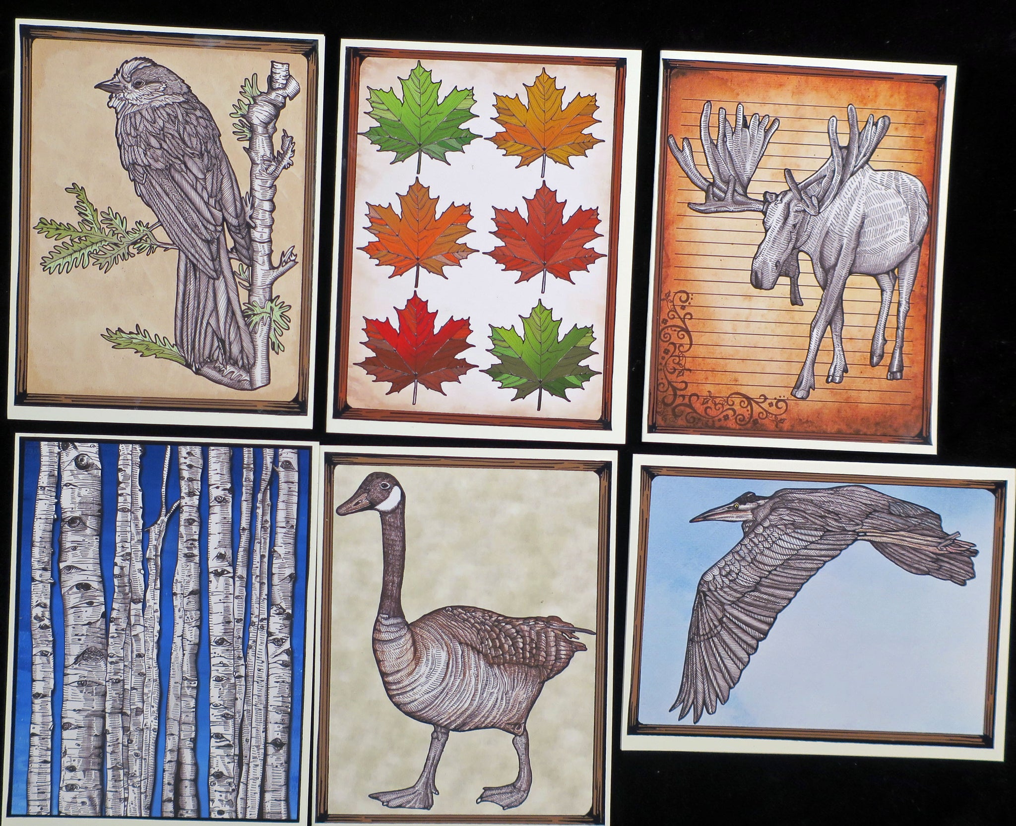 Cards: Moose, Maple Leaves, Grey Jay (National bird of Canada), Great Blue Heron, Canada Goose, Birch Trees