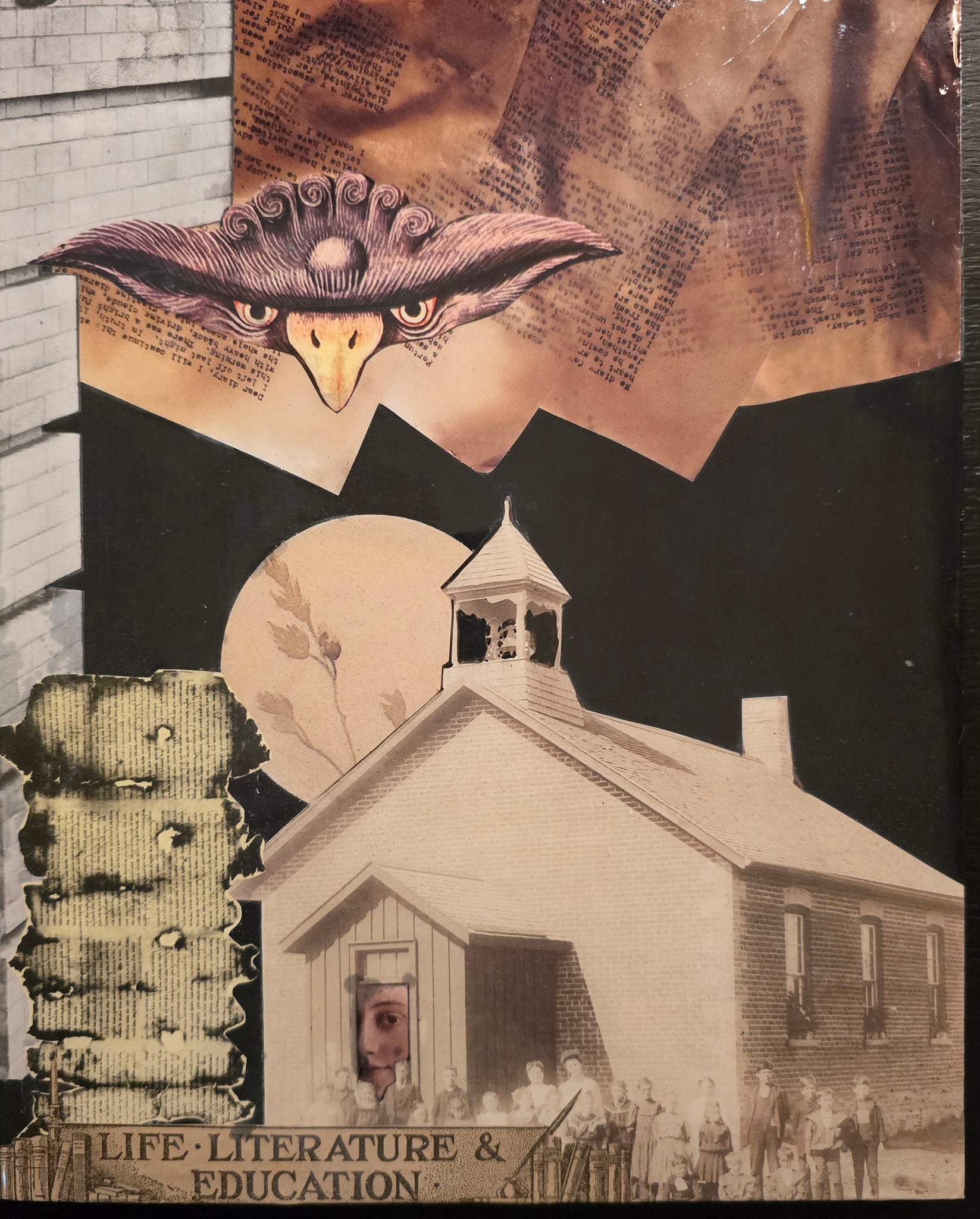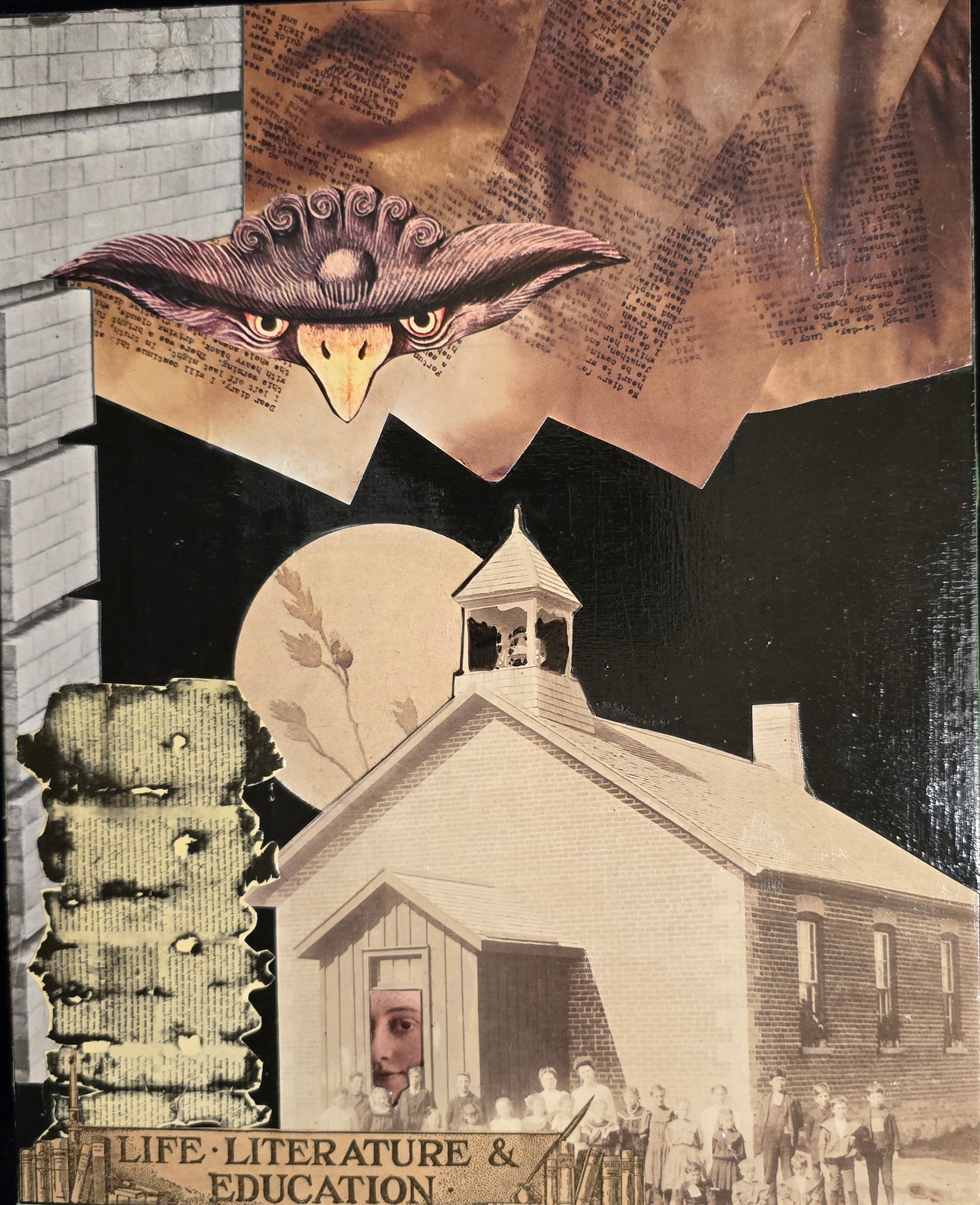 Collage block finished with poured resin. (fun fact... the woman in the door of the school house is an ancestor of mine)